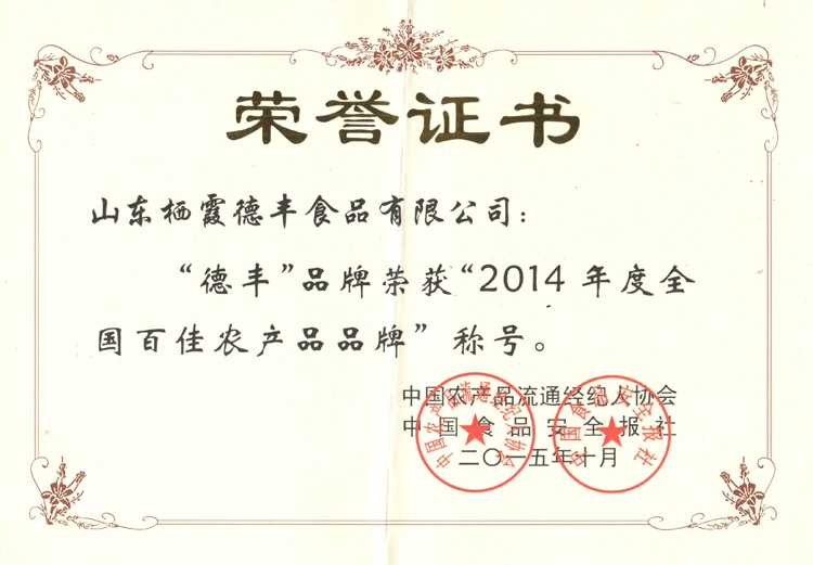 2014年度全國百強(qiáng)農(nóng)產(chǎn)品候選經(jīng)紀(jì)人、百佳農(nóng)產(chǎn)品候選品牌經(jīng)過各地農(nóng)產(chǎn)品經(jīng)紀(jì)人協(xié)會(huì)、供銷合作社,以及共青團(tuán)組織、婦聯(lián)等部門逐級(jí)推薦,評(píng)委會(huì)辦公室初審,9月12日評(píng)委審定會(huì)審定等程序產(chǎn)生,在2014年度的百佳農(nóng)產(chǎn)品品牌評(píng)選活動(dòng)中,棲霞德豐食品有限公司榮獲全國百佳農(nóng)產(chǎn)品品牌。