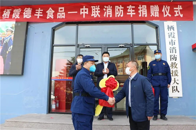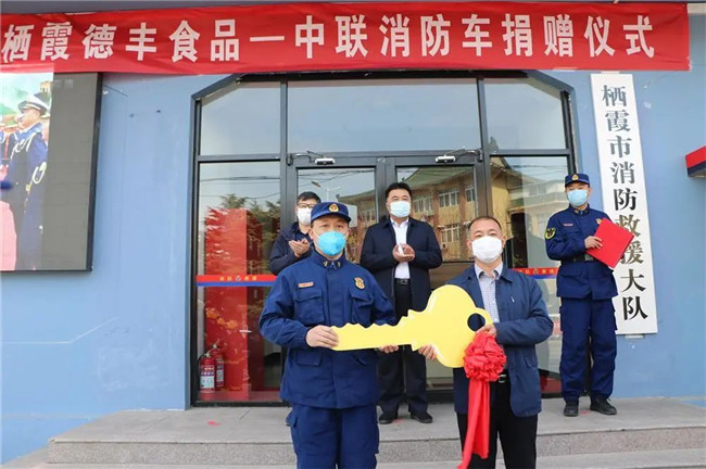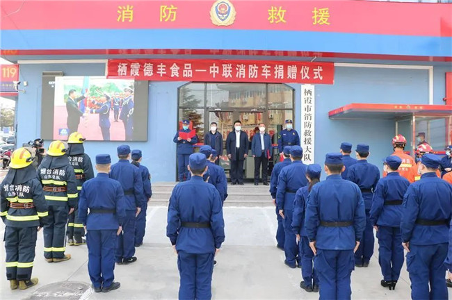 3月25日,棲霞市消防救援大隊營區(qū)喜氣洋洋,棲霞德豐食品有限公司向大隊捐贈消防車交接儀式正在隆重舉行。