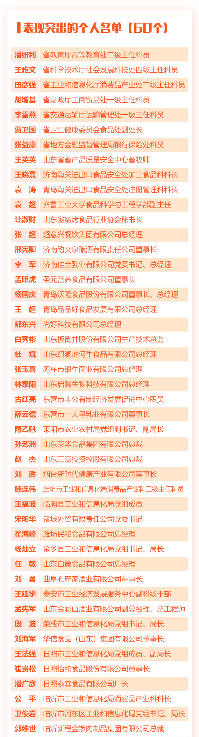 2022年,在以習(xí)近平同志為核心的黨中央堅(jiān)強(qiáng)領(lǐng)導(dǎo)下,全省各級(jí)各部門(mén)各單位和食品戰(zhàn)線廣大黨員干部職工堅(jiān)持以習(xí)近平新時(shí)代中國(guó)特色社會(huì)主義思想為指導(dǎo),深入學(xué)習(xí)貫徹黨的二十大精神,認(rèn)真落實(shí)習(xí)近平總書(shū)記對(duì)山東工作的重要指示要求,錨定“走在前、開(kāi)新局”,團(tuán)結(jié)一心、攻堅(jiān)克難,全省食品產(chǎn)業(yè)持續(xù)提質(zhì)增效,涌現(xiàn)出了一批推動(dòng)食品產(chǎn)業(yè)高質(zhì)量發(fā)展的先進(jìn)集體和個(gè)人。為充分發(fā)揮先進(jìn)示范帶動(dòng)作用,省委、省政府決定,對(duì)省發(fā)展和改革委員會(huì)工業(yè)處等40個(gè)表現(xiàn)突出的集體、潘妍利等60名表現(xiàn)突出的個(gè)人予以通報(bào)表?yè)P(yáng)。